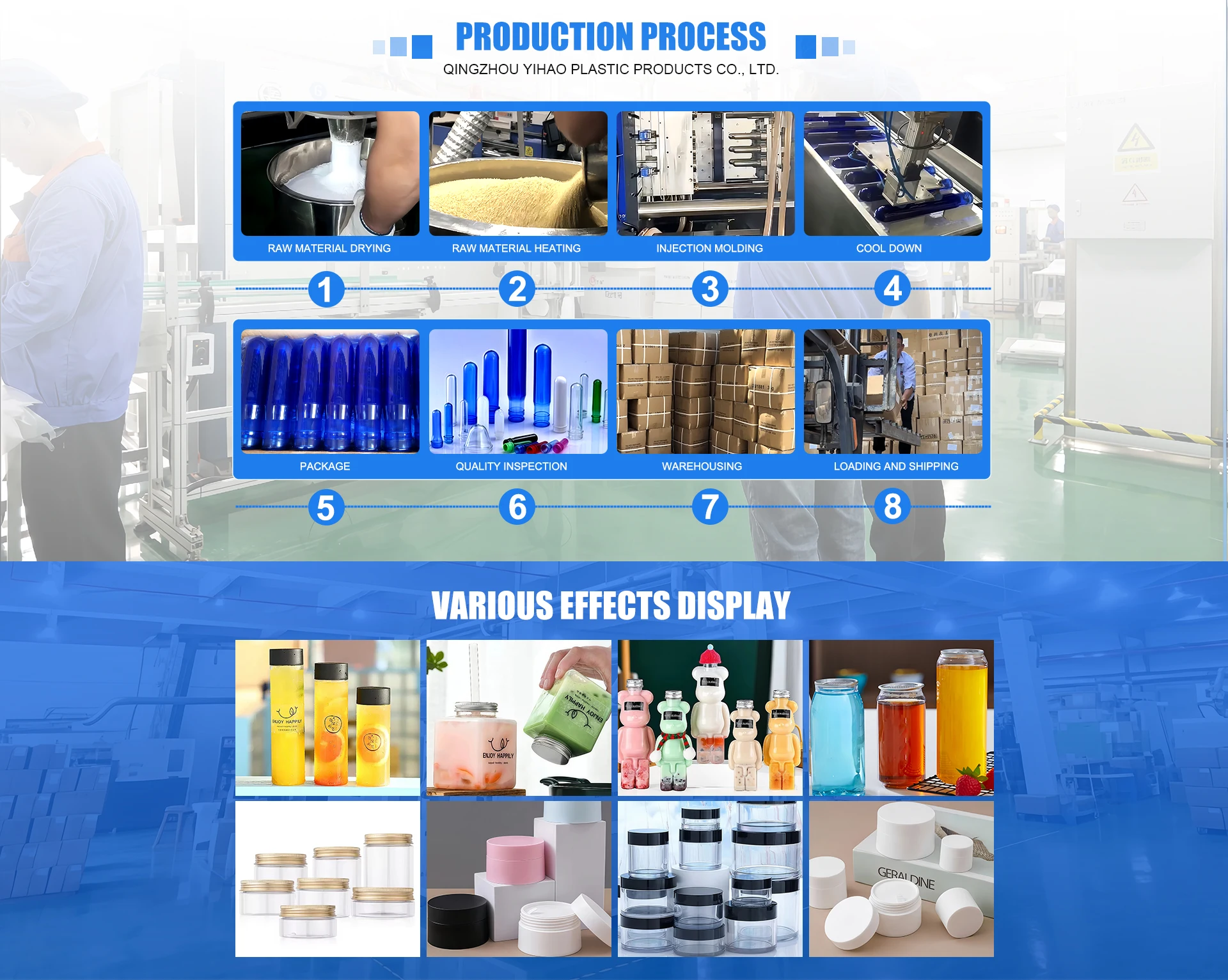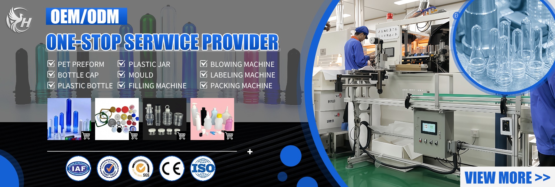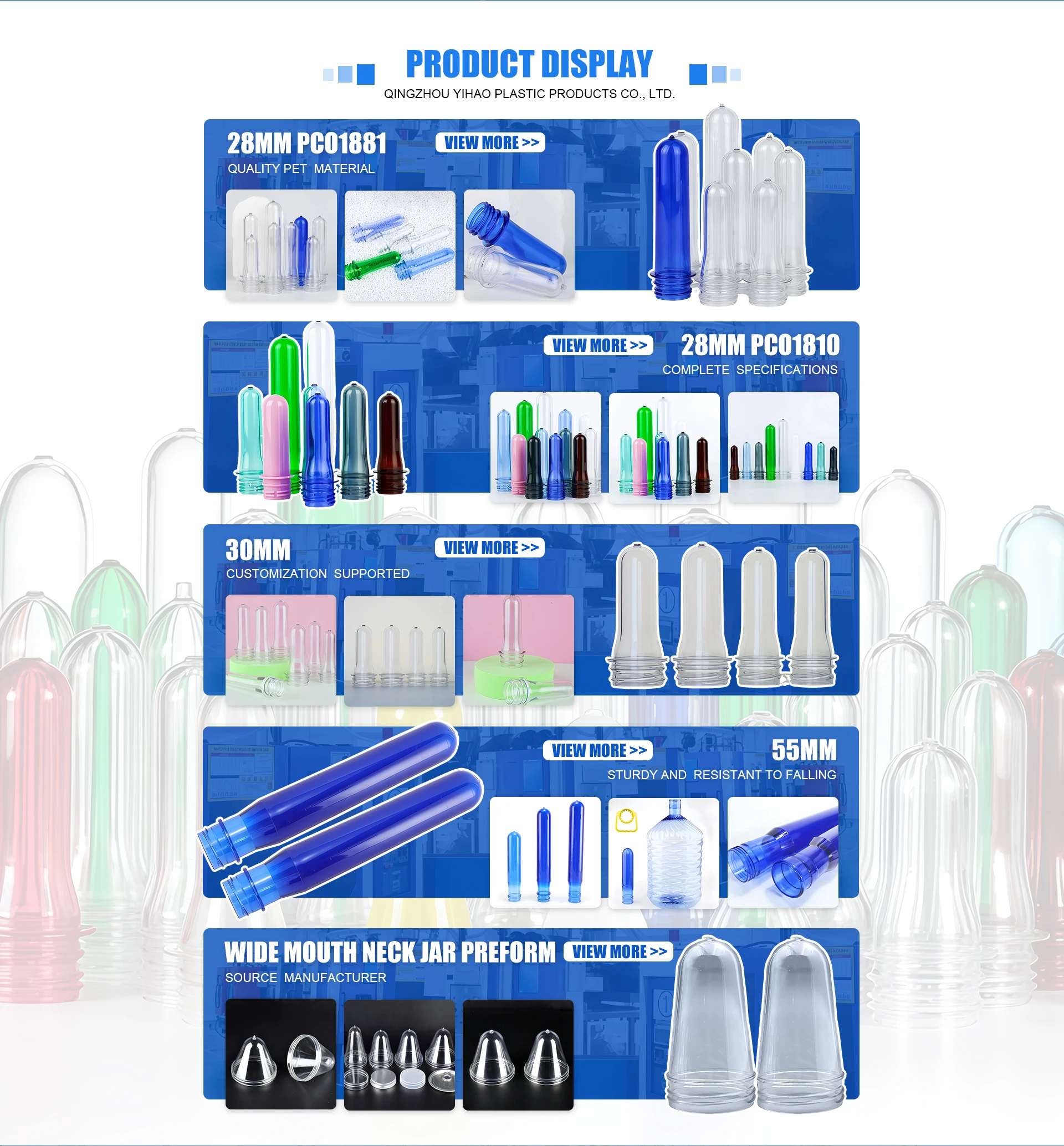 Productos principales:Preforma de botella de agua PET, tapa de botella de plástico, preforma de tarro de cuello de boca ancha, tapa de rosca de aluminio, botella de plástico
